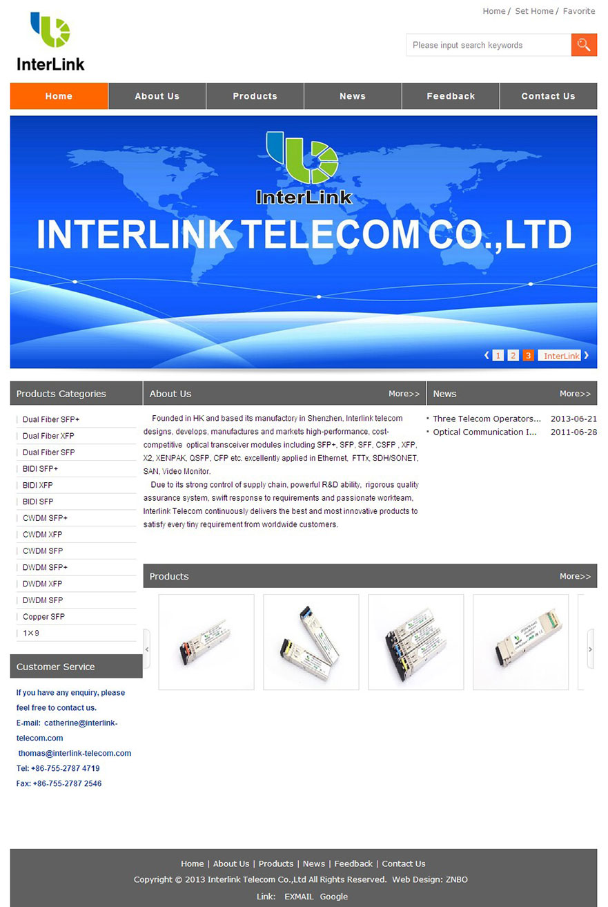 Founded in HK and based its manufactory in Shenzhen, Interlink telecom designs, develops, manufactures and markets high-performance, cost-competitive optical transceiver modules including SFP+, SFP, SFF, CSFP , XFP, X2, XENPAK, QSFP, CFP etc. excellently applied in Ethernet, FTTx, SDH/SONET, SAN, Video Monitor.